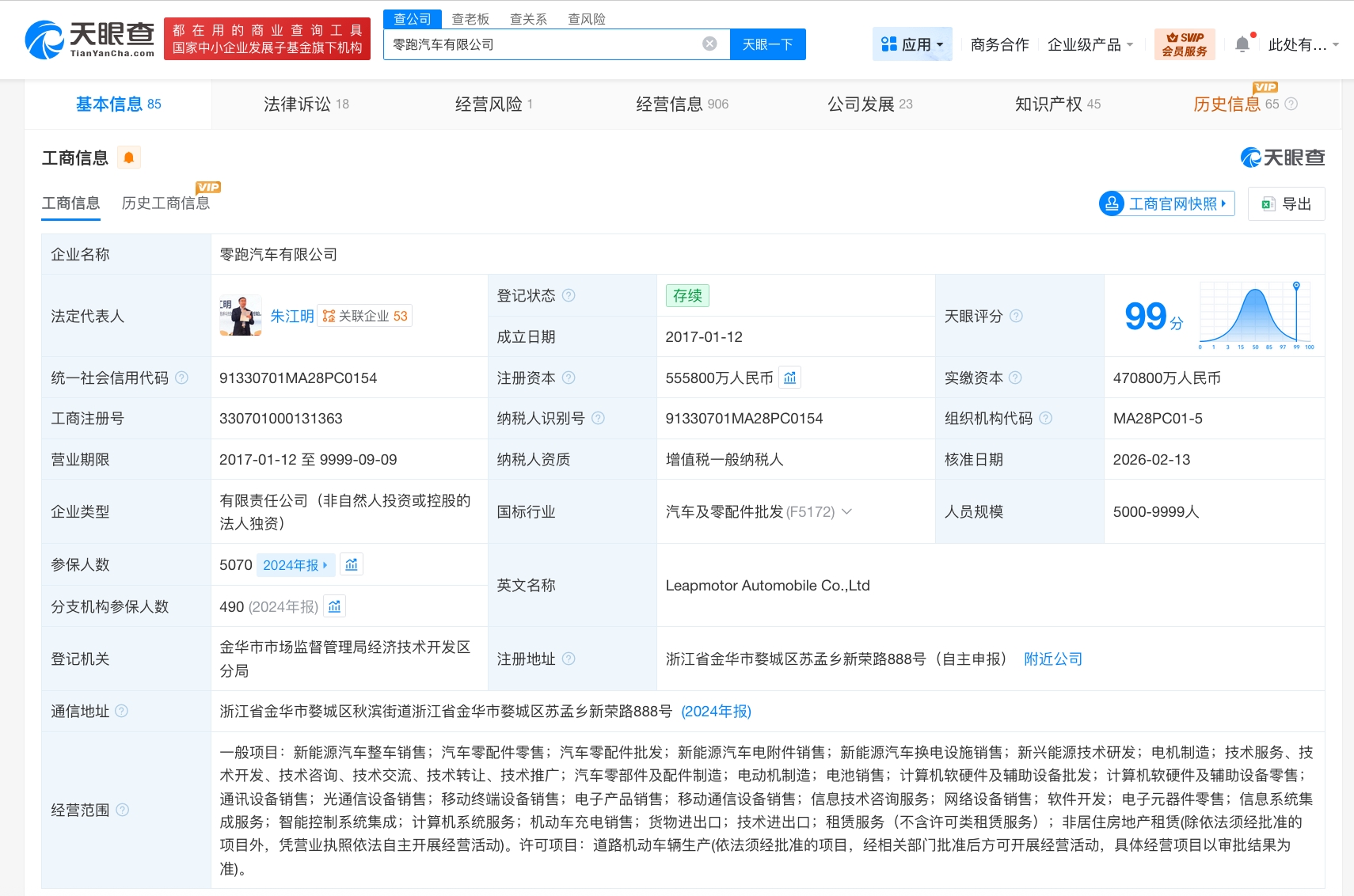 零跑汽车有限公司成立于2017年1月,法定代表人为朱江明。股东信息显示,该公司由浙江零跑科技股份有限公司全资持股。