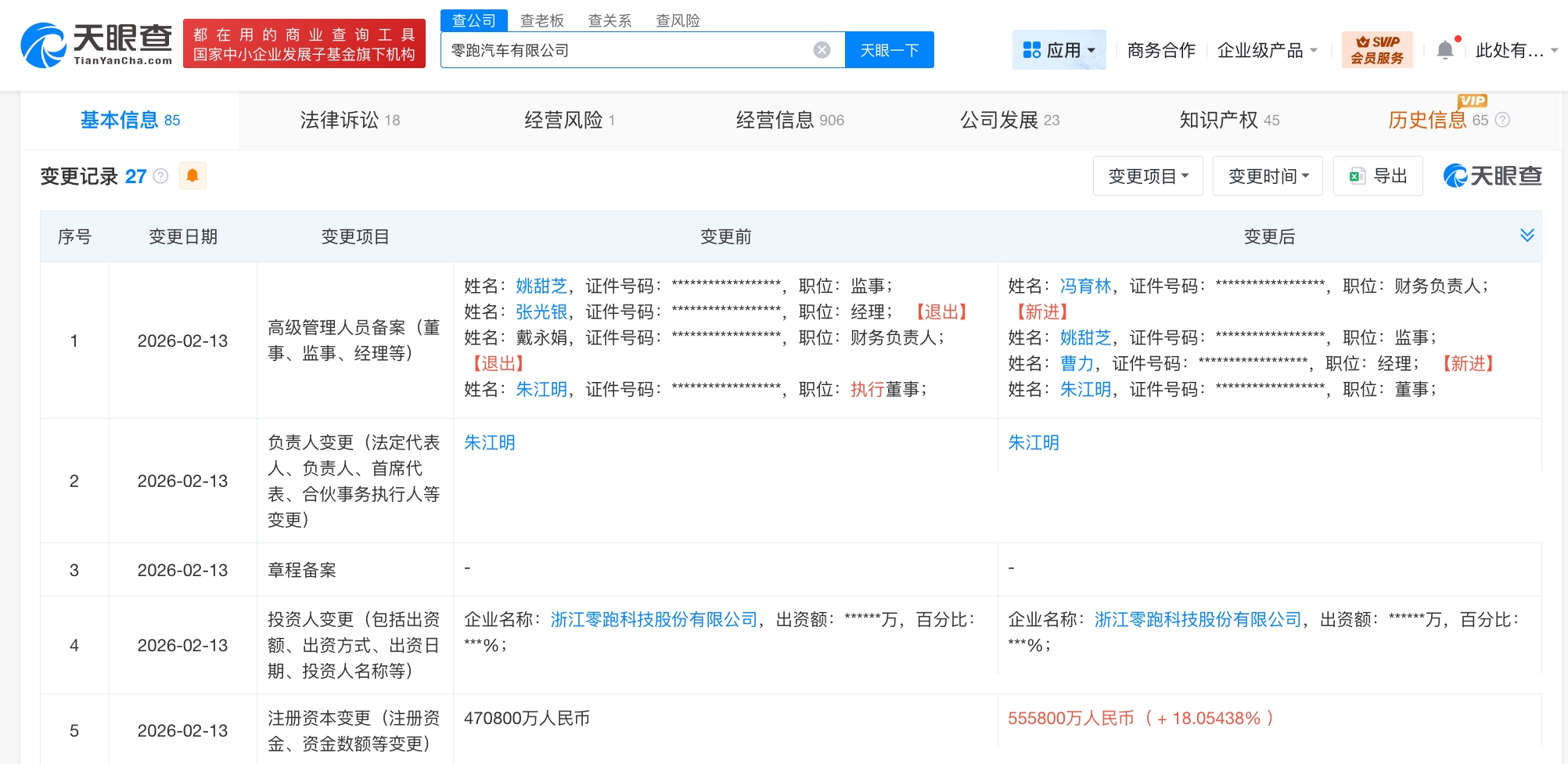 【大河财立方消息】天眼查App显示,近日,零跑汽车有限公司发生工商变更,注册资本由47.08亿人民币增至55.58亿人民币,增幅约18%,朱江明由执行董事改任董事,同时,多位高管发生变更。