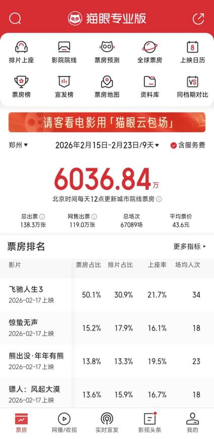 档期内,郑州全市电影排片共计6.7万场,吸引138.3万人次走进影院。其中,大年初一(2月17日)单日观影人次达30.5万,票房达1406.6万元。
