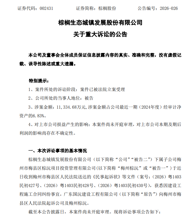 【大河财立方消息】2月24日,棕榈股份公告,因工程合同纠纷,广东国沅建设工程有限公司将梅州市梅县区棕沅项目投资管理有限公司及棕榈股份起诉至法庭,请求支付工程尾款及违约金共计1.13亿元。目前,梅州市梅县区人民法院已受理本案,尚未开庭审理。