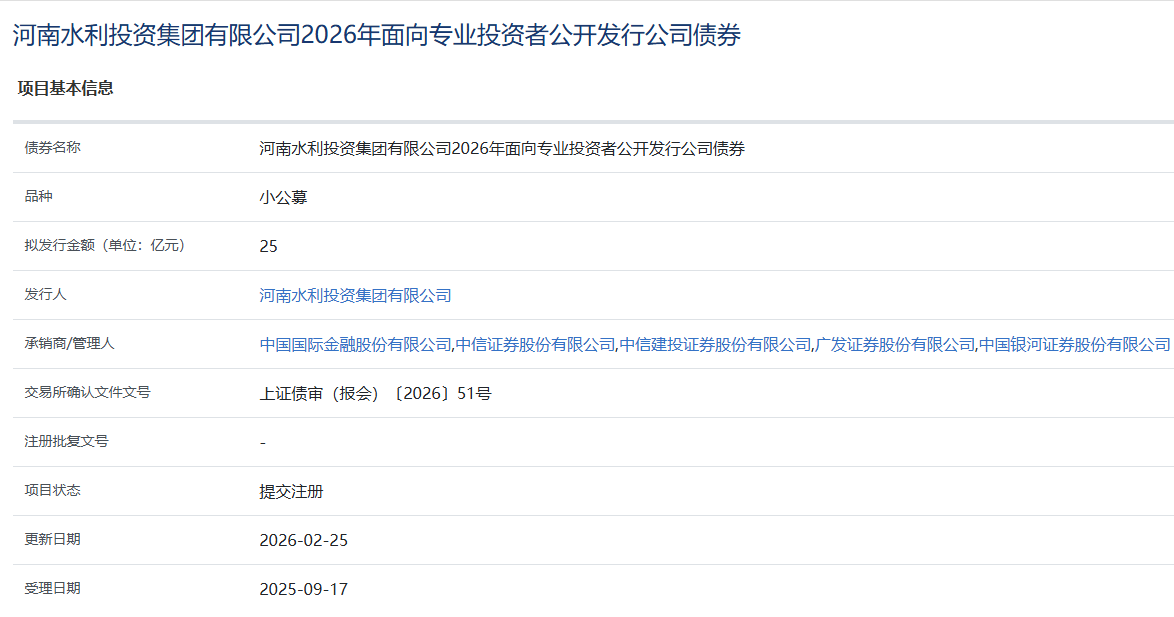 【大河财立方消息】2月25日,河南水利投资集团有限公司2026年面向专业投资者公开发行公司债券项目提交注册。