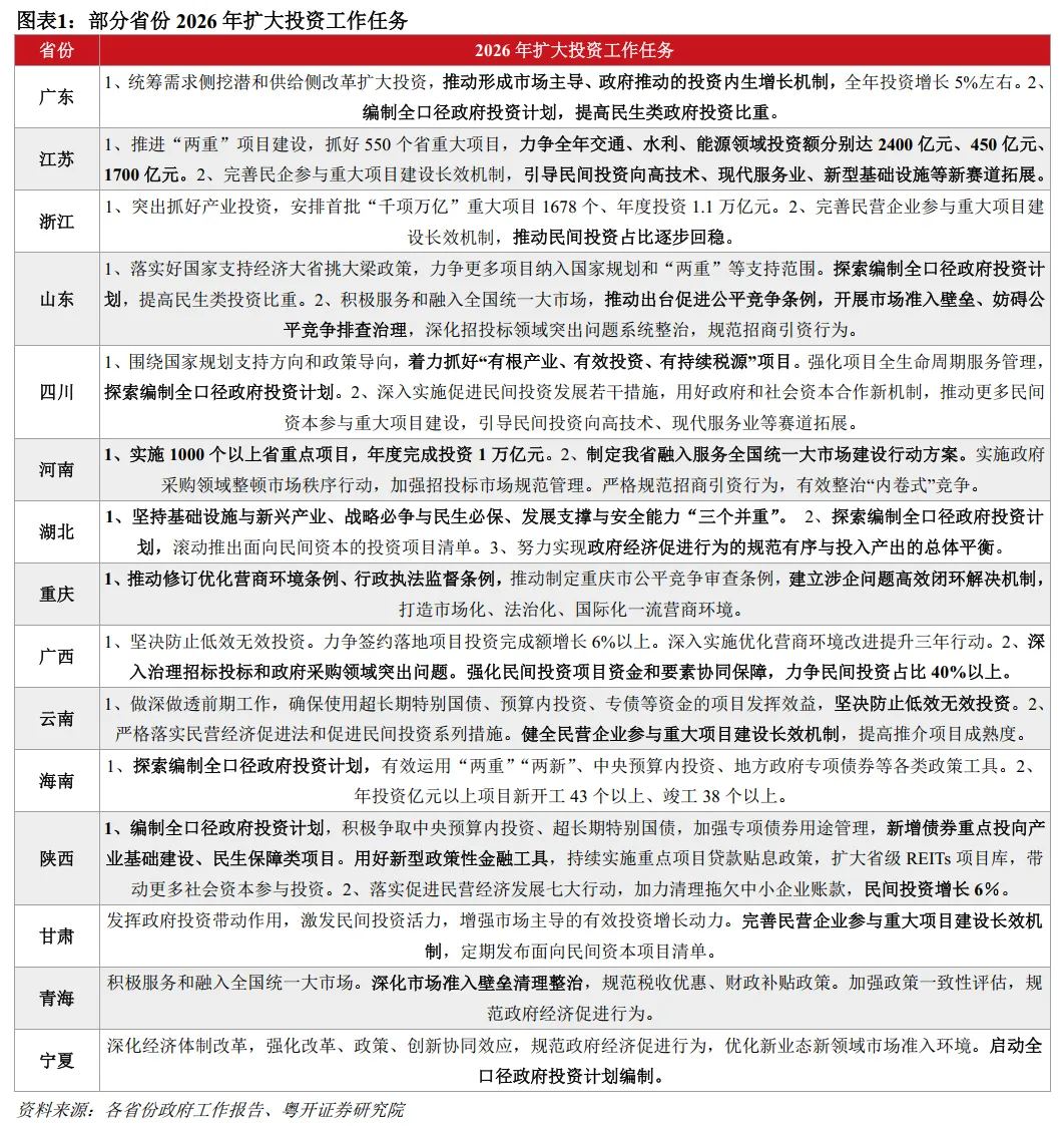 其二,政府投资提质增效,启动编制全口径政府投资计划。地方财政紧平衡背景下,提高政府投资效能日益关键,各地强调“坚决防止低效无效投资”,要让每一分财政资金发挥投资效益。广东、山东、四川、湖北、海南、陕西、宁夏、新疆等省份探索编制全口径政府投资计划,确保超长期国债、中央预算内资金、专项债等各项政府投资资金精准高效运用。广东提出适度超前建设新型基础设施,并提高民生类政府投资比重;湖北“健全政府投资定期评估调整机制”;陕西用好新型政策性金融工具,扩大省级REITs项目库,带动更多社会资本参与投资;贵州强调“投资必问效、无效必问责”,出台政府投资项目全生命周期管理办法,制定全省闲置低效项目盘活行动方案。