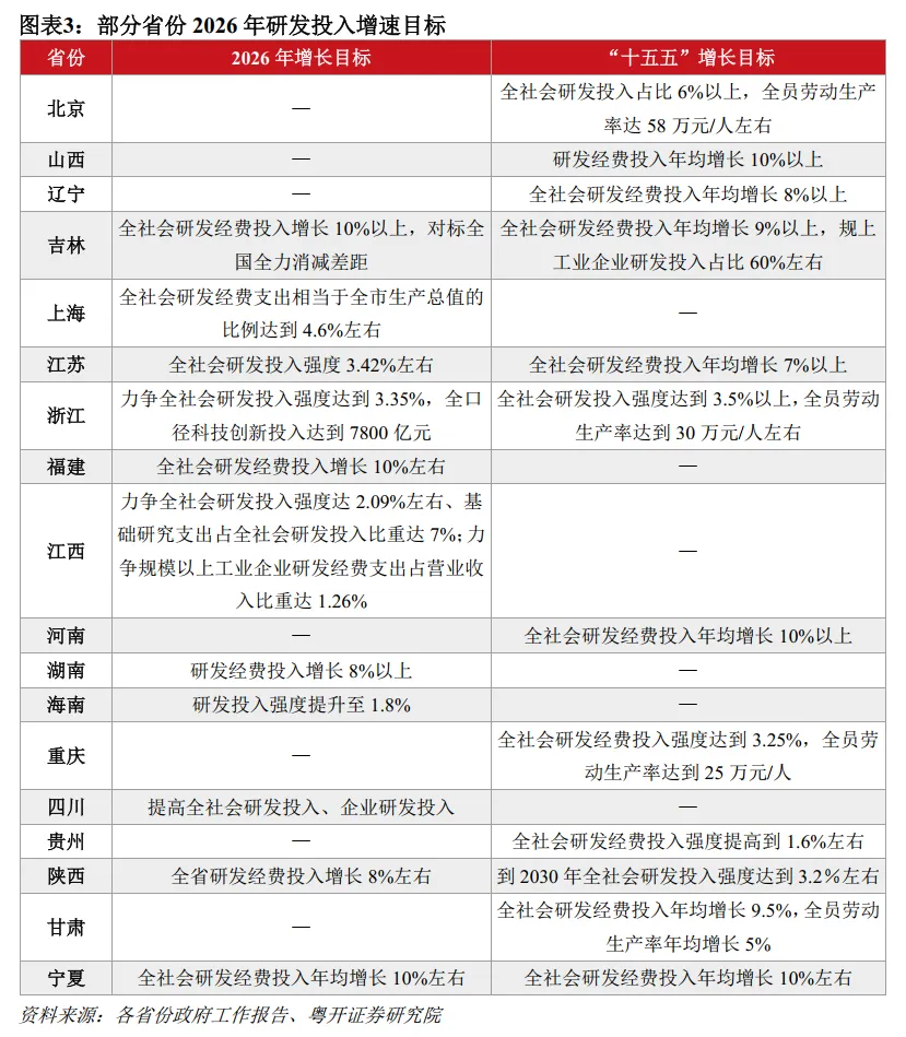 一是加大科技创新研发投入,激发企业创新主体活力。投入增速上,全国至少有18个省份提出“十五五”期间或2026年全社会研发投入增速目标,科技创新驱动高质量发展。浙江聚焦建设“创新浙江”,2026年全口径科技创新投入要达到7800亿元;福建、吉林、宁夏均提出2026年全社会研发经费投入增长10%的目标;湖南、陕西目标增长8%。投入方式上,各省份不仅要求政府增加科技创新支出,还强化企业科技创新的主体地位,支持企业加大研发投入强度。广东作为全国研发投入第一大省,2026年要求研发产出效率和效益保持领先,尤其是完善政府投入政策体系,提高科技支出总量和比重,深化财政科技经费分配使用机制改革。浙江、山西、吉林等省份聚焦企业创新,支持企业牵头组建创新联合体,支持企业设立研发机构和技术中心。福建、江西等省份实施规上工业企业研发活动提升行动,支持企业参与重大科技项目攻关。
