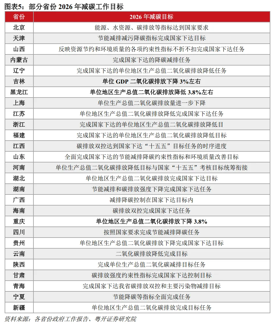其一,地方加强碳排放总量和强度双控考核,完善碳排放核算制度。2026年,全国有27个省份提出了减碳工作目标,重庆、吉林、黑龙江3省明确了单位GDP碳排放强度的量化指标。贵州“推行碳排放预算管理,探索开展市(州)能源活动碳排放统计核算”;广东“推进国家碳达峰试点建设,完善省市两级碳排放统计核算体系”。山西制定“双碳”评价考核办法,健全碳排放统计核算体系;甘肃制定固定资产投资项目“节能审查和碳排放评价实施办法”。