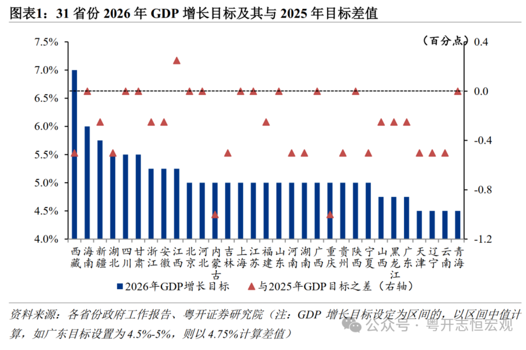 中央强调要“树立和践行正确政绩观”,31省份2026年GDP增速目标“积极务实、中枢下移”。以2025年名义GDP作为权重计算,31省份2026年GDP增长目标加权平均值为5.04%,较2025年下调了0.2个百分点。13个省份强调在实际工作中“争取更好结果”,为积极稳增长、争取开门红预留弹性空间。