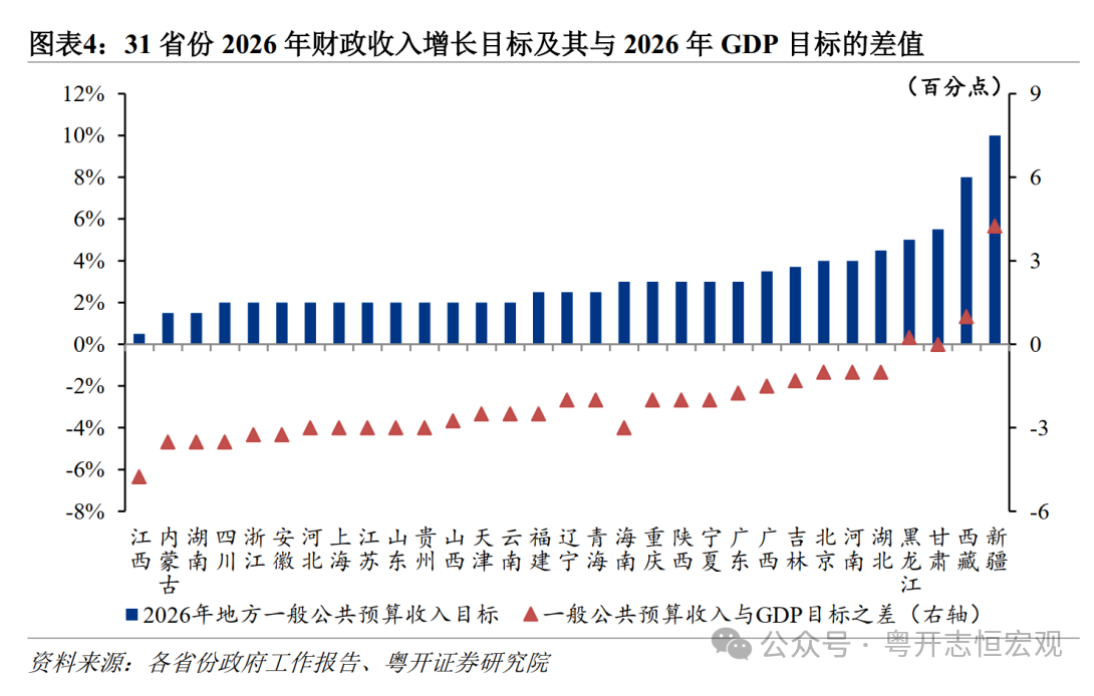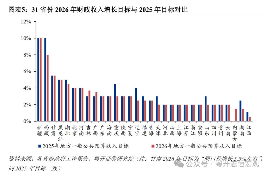 多数省份财政收入增长目标低于经济增长目标1至3个百分点,仅有新疆、西藏、黑龙江等少数省份财政收入高于GDP增速目标。江西一般公共预算收入目标远低于GDP增长目标,可能与有色金属价格预期回落、房地产行业持续调整,税收收入减收压力较大有关。经济大省2026年一般公共预算收入增长目标均低于GDP增长目标。广东2026年财政收入目标增长3%,低于4.5%至5%的GDP增长目标区间。江苏、上海、山东2026年财政收入目标均为增长2%,落后GDP增速目标3个百分点。浙江、四川、湖南财政收入目标分别落后GDP目标3.3、3.5、3.5个百分点。