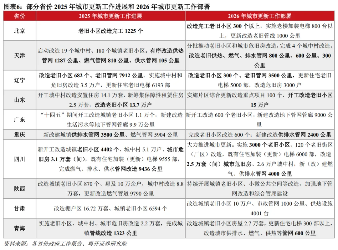 其二,高质量开展城市更新工作,积极稳妥推进老旧小区和城市管网改造。2025年中央城市工作会议首次“城市更新”写入总体要求,城市建设进入内涵式、高质量发展新阶段。2026年,广东、四川、福建、辽宁等省高质量推进城市更新工作,虽然新开工项目数量有所调减,但更加聚焦提质增效,提高城市精细化治理水平。2026年,广东将新开工改造600个老旧小区,新建改造地下管网管廊9000公里,低于“十四五”期间的年均规模(2200个、1.98万公里);四川实施3000个老旧小区改造、改造城市危旧房2.5万套;辽宁改造老旧小区300个;重庆新建改造供排水管网2400公里。