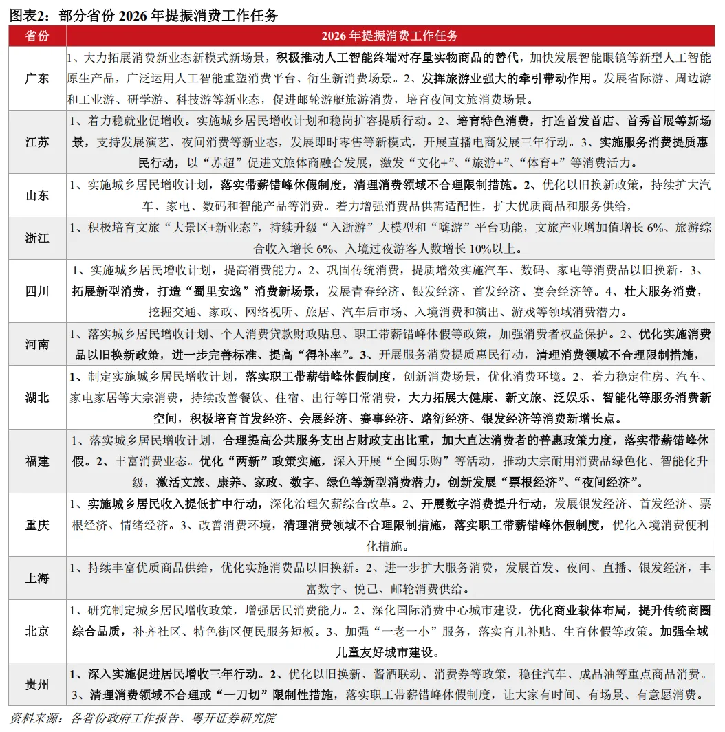 其一,部署城乡居民增收计划,提高居民消费能力。2026年,绝大多数省份均提出落实城乡居民增收计划。贵州已率先出台促进居民增收三年行动,2025—2027年,城镇、农村居民人均可支配收入分别年均增长5%、7%左右。