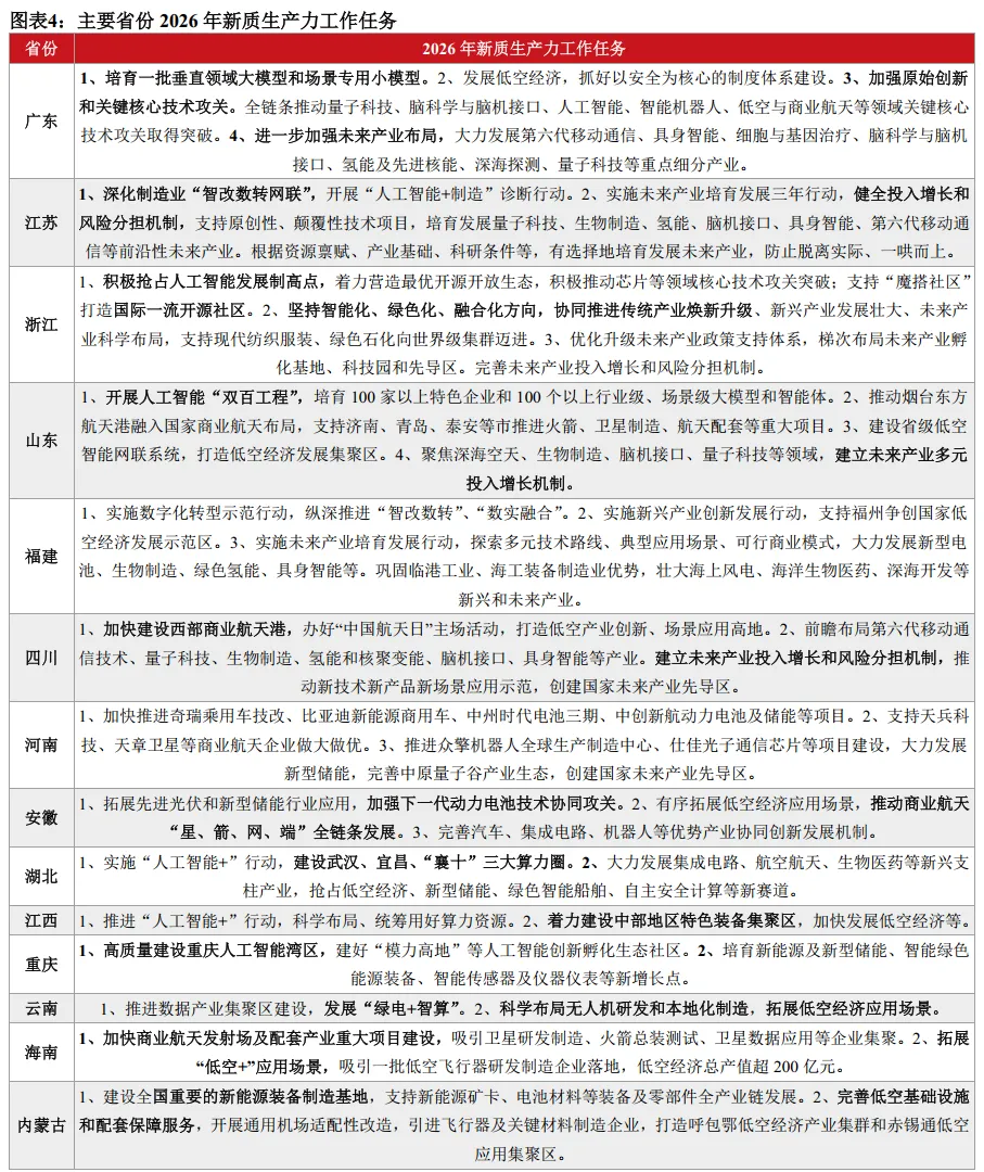 一是人工智能赋能产业升级,差异化发展战略性新兴产业,科学布局未来产业,因地制宜培育新质生产力。2026年,战略性新兴产业和未来产业的部署已成为培育新质生产力的主战场,各省因地制宜,加快布局人工智能、低空经济、新能源新材料等领域。