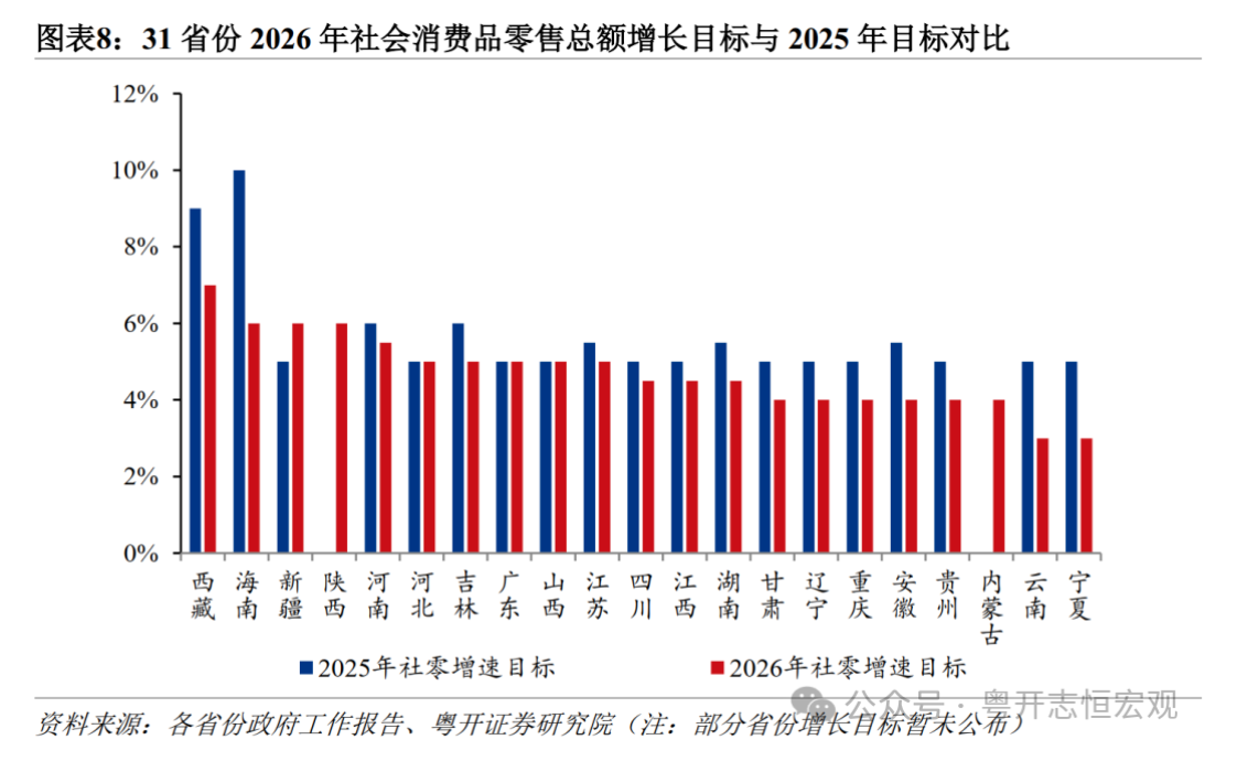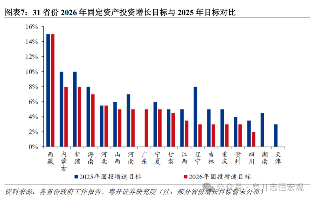 从投资看,债务重点省份固投增速目标下调幅度较大,广东推动投资止跌回稳。2026年,多数省份主动调低投资增速,经济增长模式从投资驱动转向消费和创新驱动。受益于“两重”政府投资发力、民间投资信心回暖,西藏、新疆、内蒙古等西部省份固投目标继续领跑,2026年目标分别为15%以上、8%、8%。而化债重点省份普遍下调投资增速目标,审慎安排投资项目,严控新增债务风险。甘肃从5%下调至4.5%,辽宁从8%下调至3%,重庆从5%下调至3%,贵州从4%下调至3%,天津不再明确投资增速目标,仅要求“提质增效”。经济大省淡化固投规模增长的要求,更加注重投资结构的优化和投资效益的提升,如四川目标由3.5%下调至2%,湖南目标仅要求“正增长”。广东2025年“投资增长动力不足”,2026年重新明确投资目标为增长5%,意在兼顾稳增长和优结构,既要发挥投资托底经济的作用,又要通过结构优化扩大有效投资,尽快推动投资止跌回稳。