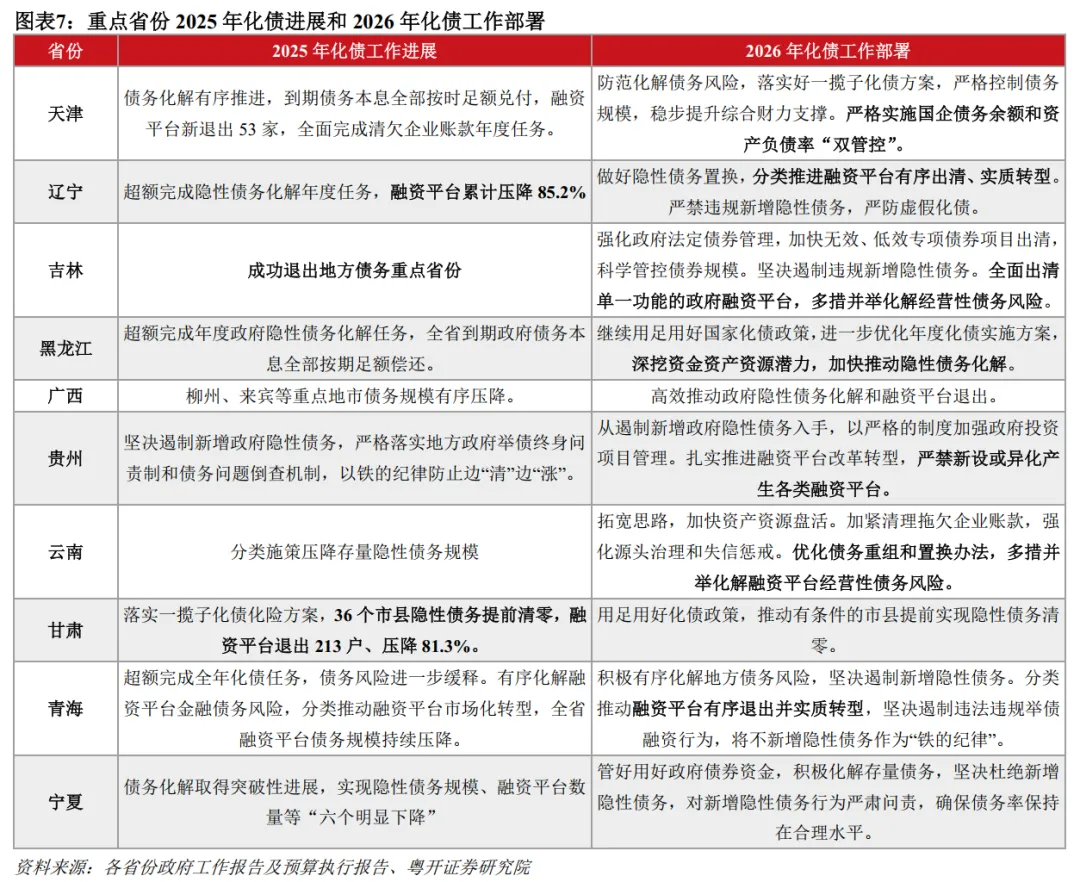 二是重点地区加快存量隐性债务化解,推动城投平台“实质转型”。其一,坚决遏制新增债务风险,压降存量隐性债务。目前重点地区的存量隐性债务化解有序推进,内蒙古、吉林已于2025年宣布“退出地方债务重点省份”。2026年,重点省份继续落实一揽子化债方案,多地提出将不新增隐性债务作为“铁的纪律”,统筹中央政策与自主财力靠前置换存量隐性债务。2026年,中央一次性下达的6万亿元的化债额度即将全部使用完毕,地方加力筹措资金加快化债。天津要求严控债务规模,“提升综合财力支撑”;黑龙江提出要“深挖资金资产资源潜力”,加快债务化解;甘肃推动有条件的市县“提前实现隐性债务清零”;云南不仅要压降隐性债务规模,还要“加紧清理拖欠企业账款,强化源头治理和失信惩戒”。其二,加快地方融资平台出清,推动城投平台实质转型。推动城投公司转型,既是防范化解地方政府债务风险的要求,又是推动国资国企高质量发展的题中之义。截至2025年9月末,全国融资平台数量较2023年3月末下降71%;一些债务重点省份平台退出进度更快,2025年末辽宁、甘肃融资平台数量分别累计压降了85.2%、81.3%。在城投经营效益下降、城投平台融资收紧的背景下,目前城投平台经营性债务难以化解,制约了城投转型的效果。2026年,多个重点省份提出要加快城投平台实质性转型。辽宁、青海“分类推进”融资平台有序出清与实质转型;吉林、云南提出“多措并举化解经营性债务风险”。其三,推动中小金融机构减量提质,健全风险监测预警处置机制。河南、福建、云南、内蒙古均将“减量提质”作为中小金融机构化险核心任务,陕西推进高风险机构“动态清零”。浙江、江西、陕西、云南健全风险监测预警与风险防控体系,确保金融风险早识别、早预警、早暴露、早处置。湖北、江西等省份坚持金融改革与严打非法金融并举,守住不发生区域性系统性金融风险底线。