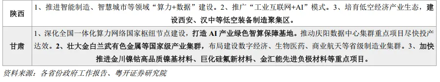 其一,深入实施“人工智能+”行动,赋能千行百业,推动算力和电力协同。“人工智能+”是赋能产业升级的主线,绝大多数省份都将人工智能经济置于产业发展核心位置。东部省份发挥科研、资本和人才优势,主攻大模型开发、核心技术、创新应用。广东提出“培育一批垂直领域大模型和场景专用小模型”;北京备案大模型数量居全国首位,创新开展政务领域大模型示范应用;浙江抢占“人工智能发展制高点”,攻关芯片等核心技术、统筹算力数据基础工程。而中西部省份依托能源优势发力“算电协同”,推动算力基础设施与新能源融合发展。贵州深入实施“东数西算”工程,优化调整“算力券”政策;山西着力推动能源转型,“争取国家算电协同试点”;新疆“推进绿色智算中心、算电协同等智能新基建工程”;云南推进数据产业集聚区建设,发展“绿电+智算”。