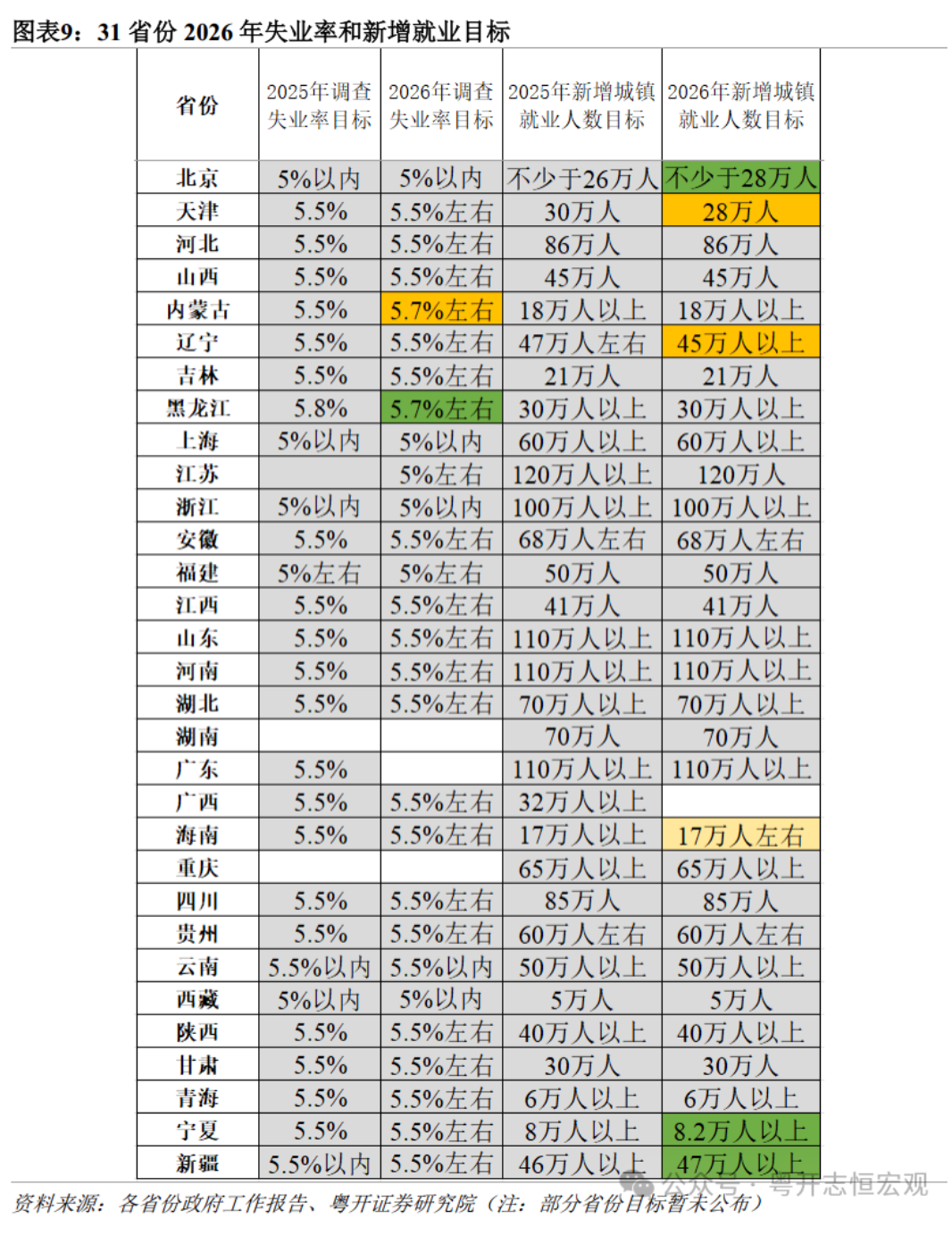 从就业看,大多数省份新增就业和失业率预期目标维持不变,体现了就业优先的政策导向。28个已披露城镇调查失业率目标的省份中,20个省份均将2026年目标设定在5.5%左右。北京、上海、浙江、西藏2026年失业率目标在“5%以内”,江苏、福建失业率目标为“5%左右”,均与上年目标相同;内蒙古从“5.5%左右”调整为“5.7%左右”,黑龙江从“5.8%以内”调整为“5.7%左右”。31个省份中,26个省份2026年新增城镇就业人数目标不变。辽宁、天津地区就业压力增加,新增城镇就业人数目标均下调了2万人;北京目标则上调了2万人;新疆、宁夏分别上调了1万人、0.2万人。