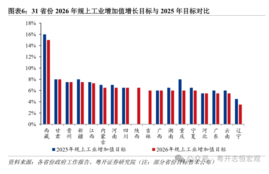 与2025年相比,仅江西上调2026年增长目标,19个省份下调了目标,11个省份基本持平。江西从5%左右提升至5%~5.5%,主要受益于新能源和装备制造驱动工业升级。重庆、内蒙古目标下调幅度较大,均从6%左右调整为5%以上、5%左右,这与两省份2025年经济实际增速未达目标,主动调整经济增长预期有关。
