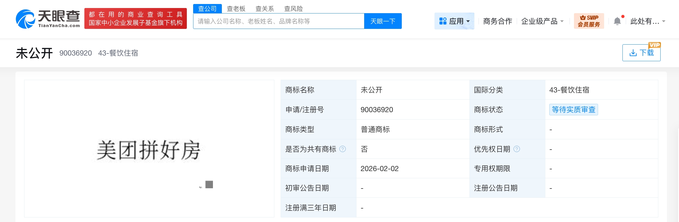 【大河财立方消息】天眼查知识产权信息显示,近日,美团关联公司北京三快科技有限公司申请注册3枚“美团拼好房”商标,国际分类为科学仪器、金融物管、餐饮住宿,当前商标状态均为等待实质审查。