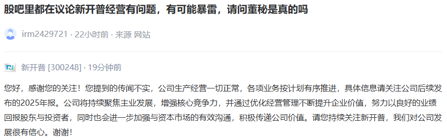 对此,新开普表示:“传闻不实,公司生产经营一切正常,各项业务按计划有序推进,具体信息请关注公司后续发布的2025年报。公司将持续聚焦主业发展,增强核心竞争力,并通过优化经营管理不断提升企业价值,努力以良好的业绩回报股东与投资者,同时也会进一步加强与资本市场的有效沟通,积极传递公司价值。”