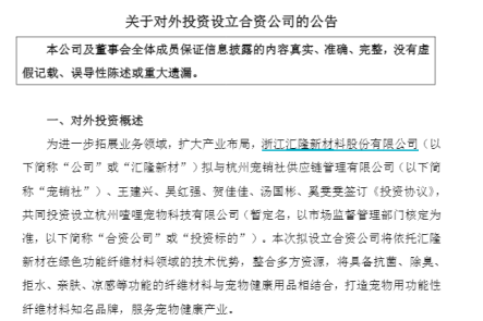 2025年9月18日,汇隆新材发布公告称,为进一步拓展业务领域,扩大产业布局,汇隆新材拟与杭州宠销社供应链管理有限公司(以下简称宠销社)、王建兴、吴红强、贺佳佳、汤国彬、奚雯雯签订《投资协议》,共同投资设立杭州喳哩宠物科技有限公司(暂定名)。该合资公司注册资本为500万元,其中汇隆新材认缴出资325万元,持股比例为65%。
