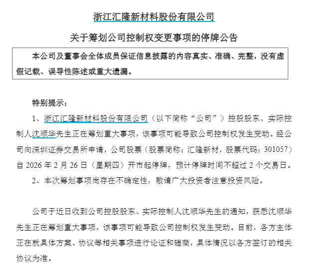 【大河财立方 记者 司高妍】2月25日,浙江汇隆新材料股份有限公司(以下简称汇隆新材,股票代码:301057)发布公告称,该公司控股股东、实际控制人沈顺华正在筹划重大事项,该事项可能导致公司控制权发生变动。
