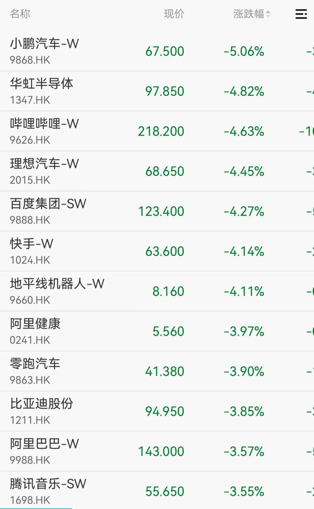 科网股集体杀跌,Wind数据显示,哔哩哔哩、百度集团、快手跌逾4%,阿里巴巴、腾讯音乐、携程集团跌超3%,美团、京东、同程旅行、腾讯控股跌超2%。小鹏汽车跌5.06%,零跑汽车、比亚迪股份跌近4%。