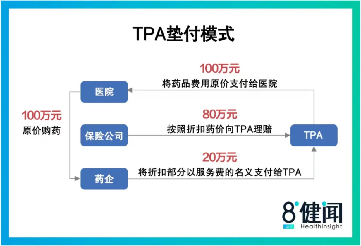 具体路径是:第三方TPA机构凭借保司的授权协议,先代保司向医院支付全价药费,医院开出全额发票;保司按折扣后的金额向TPA理赔;药企再以服务费的名义将折扣部分支付给TPA。
