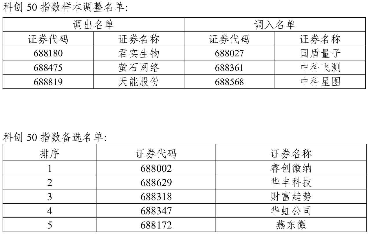 科创50指数更换3只样本,将国盾量子、中科飞测、中科星图调入名单,将君实生物、萤石网络、天能股份调出名单。