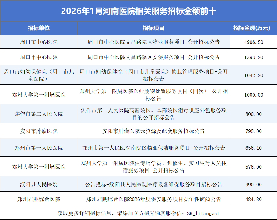 周口市中心医院文昌路院区安保服务项目以1393.20万元位列第二。周口市妇幼保健院(周口市儿童医院)物业管理服务项目以1042.20万元排名第三,跻身千万级招标项目行列。(获取详细项目信息,请添加立方招采通客服微信:SK_lifangzct)