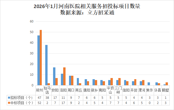 【大河财立方 见习记者 李雯雯】立方招采通数据显示,2026年1月河南医院相关服务招标与中标项目共312个,其中招标项目176个,中标项目136个,涵盖维保、物业、信息化等多元服务需求。郑州以超三成的市场占比持续领跑全省,区域核心地位稳固;周口则凭借多个千万级项目密集释放,成为当月市场一大亮点。