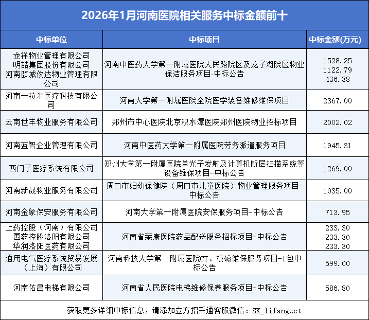 立方招采通数据显示,2026年1月河南医院相关服务招标项目共176个,招标金额在500万元以上的项目共8个,1000万元以上的项目共4个。招标金额前十项目总金额达12147.4万元,涵盖物业服务、安保服务、医疗废物处置、消毒供应外包等多个核心领域。