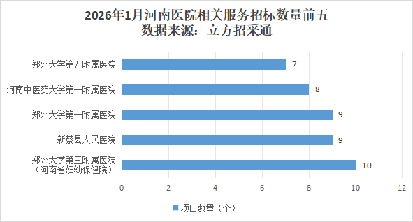 从招标单位活跃度来看,1月河南医院相关服务招标市场呈现头部医院集中发力的态势。郑州大学第三附属医院(河南省妇幼保健院)、新蔡县人民医院、郑州大学第一附属医院等五家单位,合计发布43个招标项目,占当月全省招标项目总量的24.4%。