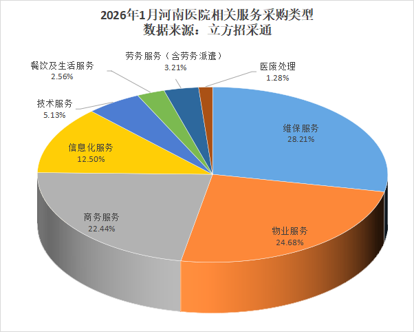 从采购类型来看,维保服务、物业服务与商务服务为1月河南医院相关服务采购量排名前三的领域。其中,维保服务以88个项目居首,医院设备与设施运维需求持续释放;物业服务共77个项目,涵盖病房楼保洁、院区安保、后勤管理等基础配套服务;商务服务以70个项目位列第三,服务内容涵盖租赁、配送、培训、会议及法律顾问等多元配套服务。三者合计占当月招采项目总量的75.3%,主导全省医院服务采购市场。