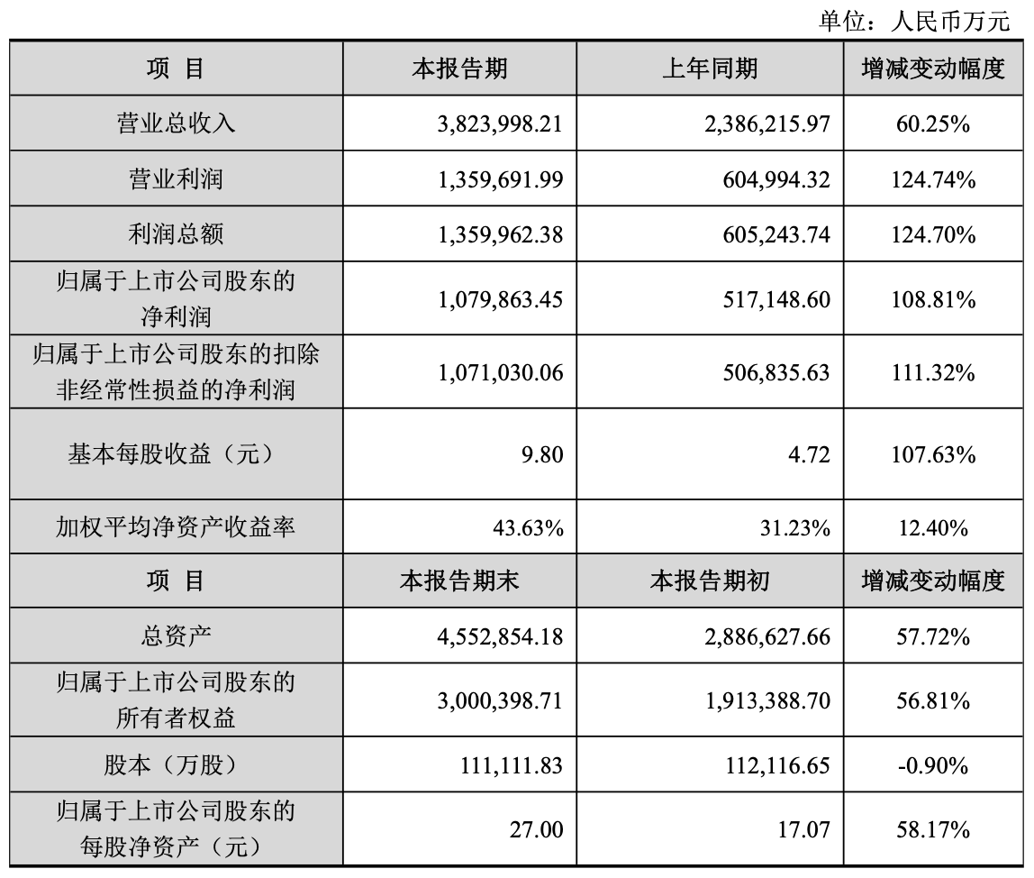【大河财立方消息】2月27日,中际旭创(300308.SZ)发布2025年度业绩快报,报告期内公司实现营业总收入382.4亿元,同比增长60.25%;实现归属于上市公司股东的净利润107.99亿元,同比增长108.81%。