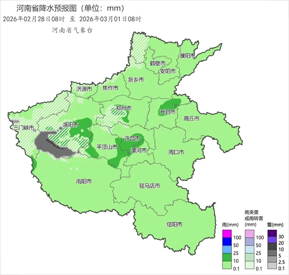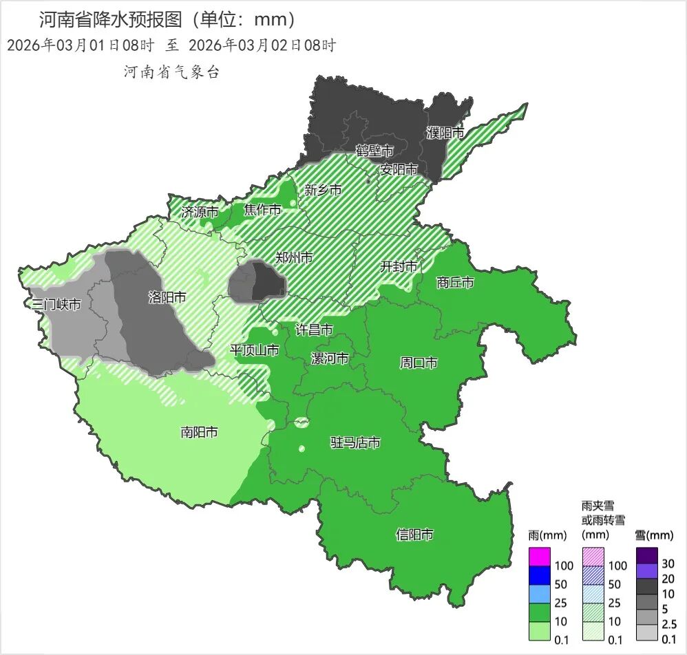 随着暖湿气流将水汽源源不断向河南输送,今明两天雨雪的范围将逐步覆盖到全省。具体来看,今天的雨雪相对较弱,河南大部以小雨为主,西部、西北部部分县市会逐渐转为雨夹雪或小到中雪;明天(3月1日)将进入本轮雨雪的最强时段,全省大部将下起小到中雨,气温较低的西部、北中部会有更多地区由雨转为雨夹雪或小到中雪,尤其是豫北的安阳到濮阳西部一带以及豫西、郑州西部部分县市将出现大到暴雪。