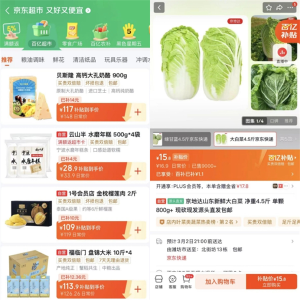 2月26日,京东上线“百亿超市”频道,拟在未来3年投入超200亿元商品补贴,目标更直指助力品牌实现2000亿元额外销售增量。该补贴计划覆盖休食、生鲜、酒水、饮料、粮油调味、个护、宠物等全品类生活用品,京地达、京鲜生等部分自营生鲜商品同步纳入,如白菜、大葱、西红柿、萝卜等。