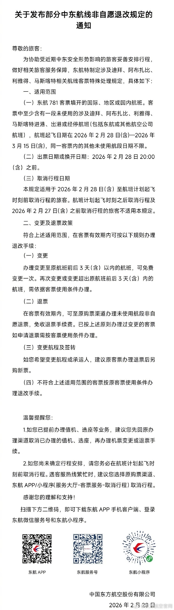 受中东安全形势影响,海南航空、中国国航、东方航空等先后发布相关航线退改票规定。