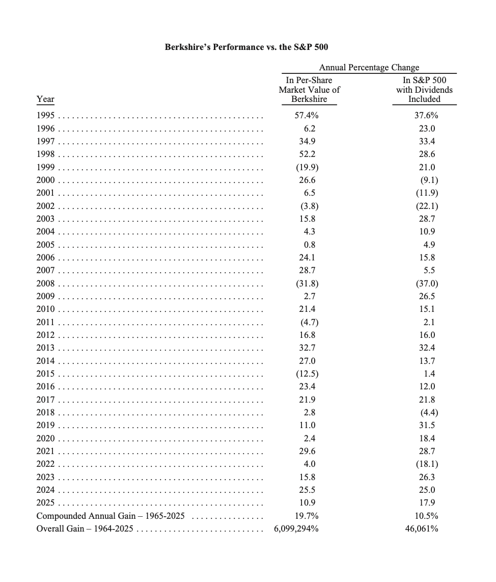 拉长时间来看,伯克希尔·哈撒韦的年度表现十分亮眼。1965年~2025年 60年间,其复合年化回报率为19.7%,同期标普500指数包含股息的回报率水平为10.5%。这也是巴菲特的成绩单。