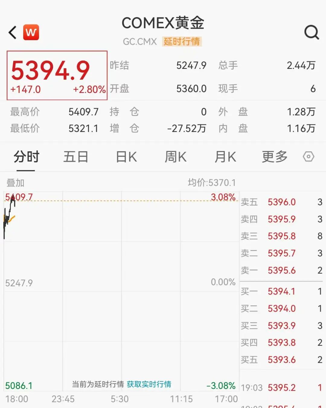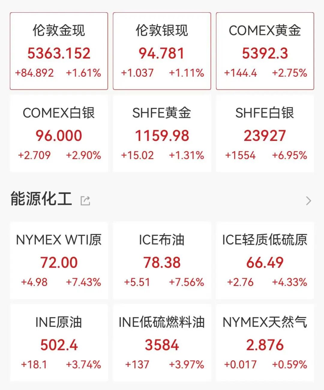 截至发稿,COMEX黄金涨2.80%,盘中突破5400美元整数关口,COMEX白银涨2.9%,报96美元/盎司。现货黄金涨1.61%,现报5363.15美元/盎司;现货白银盘中一度涨近3%,现报94.78美元/盎司。