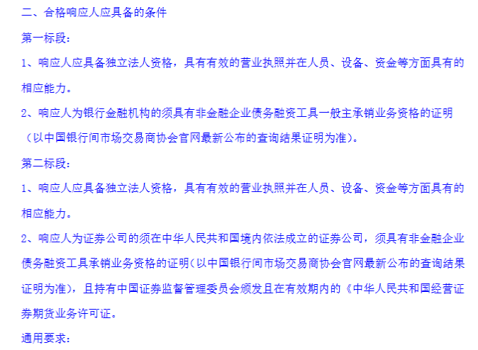 本次招标将分为两个标段。其中,第一标段选定1家承销机构以保障采购人顺利发行债券,达到国家有关债券发行审批机构要求,设定融资方案,组建项目专业工作团队,统筹协调债券受托管理人、会计师事务所、律师事务所、信用评级机构等所有中介机构的各项工作,制作申报材料,进行市场询价及发行。