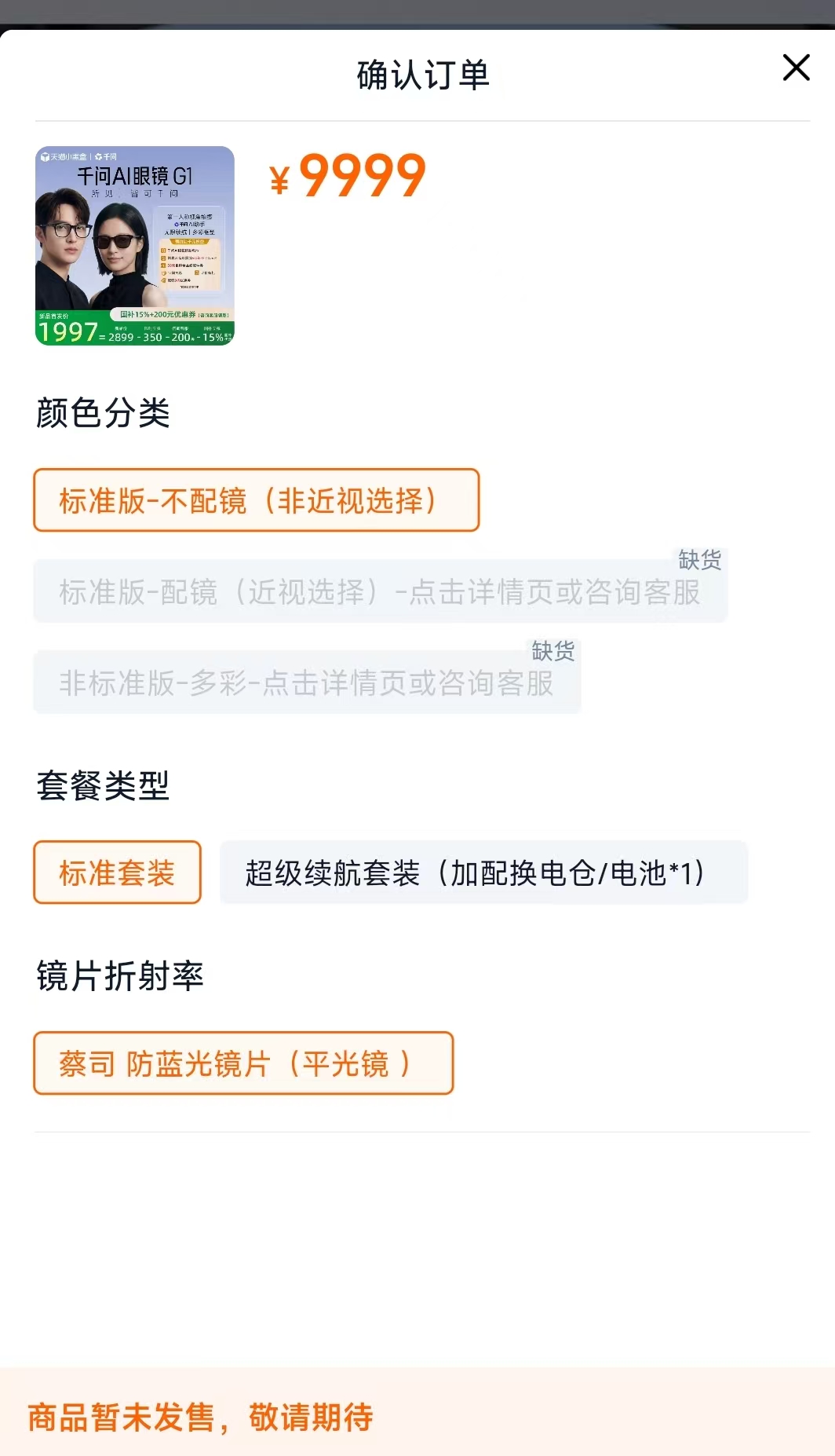 天猫的商品页面信息显示,该产品针对非近视人群和近视人群分别推出“标准版-不配镜““标准版-配镜”规格,另有“非标准版-多彩”规格;套餐类型则分为标准套装与超级续航套装(加配换电仓/电池*1)。