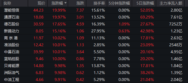 油气开采、天然气、能源设备、海运等概念持续走强,潜能恒信、通源石油、南京港、准油股份、中曼石油、蓝焰控股、贝肯能源、洲际油气、中油工程、山东墨龙、泰山石油等涨停,海油工程、中国海油、首华燃气涨幅居前。