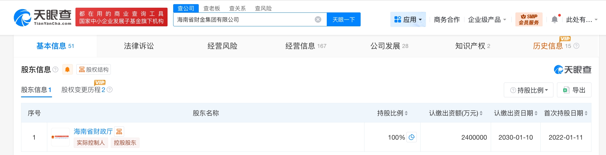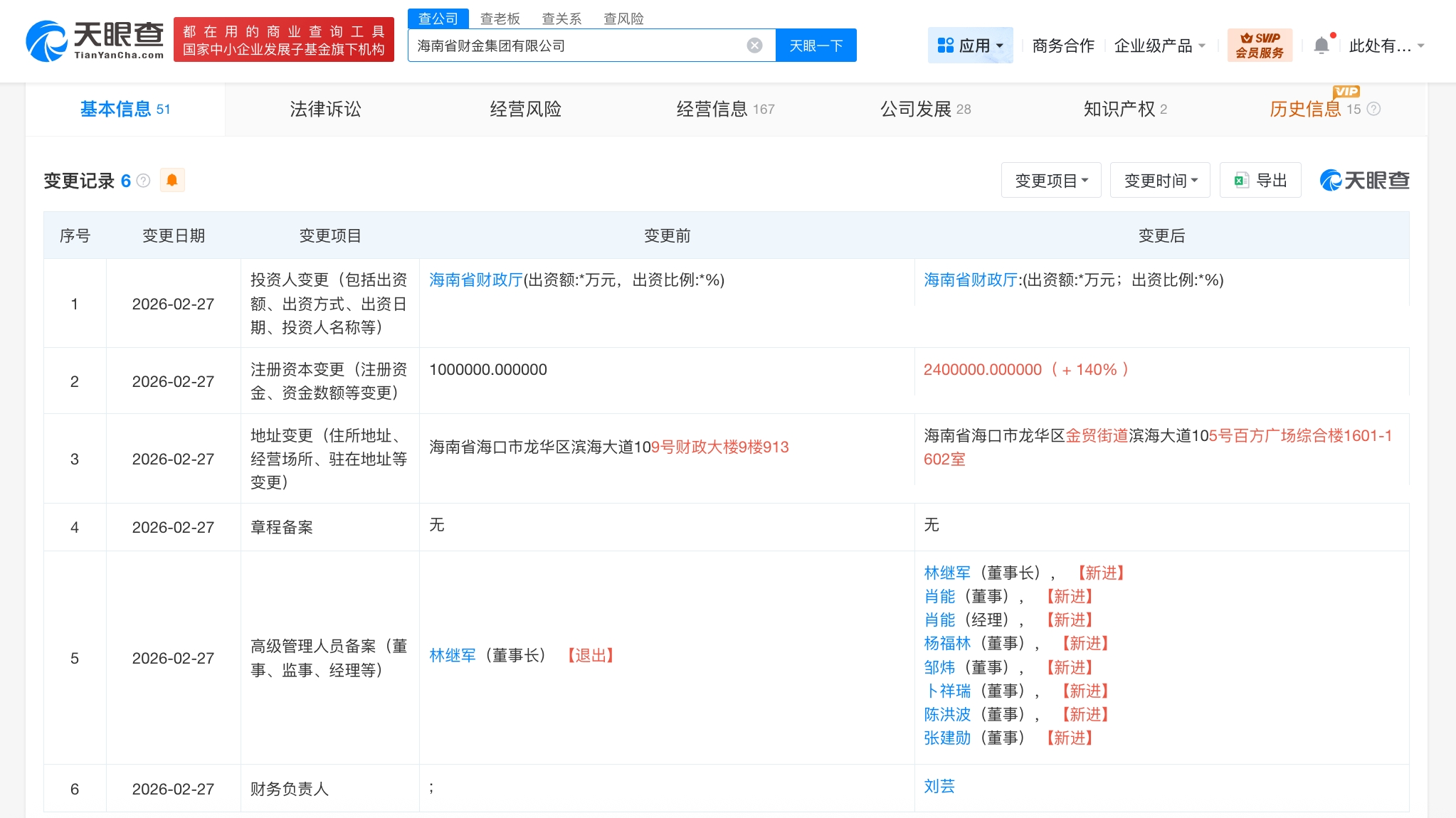 【大河财立方消息】天眼查工商信息显示,近日,海南省财金集团有限公司(以下简称“海南财金集团”)发生工商变更,注册资本由100亿人民币增至240亿人民币,增幅140%,同时,多位高管发生变更。股东信息显示,海南财金集团由海南省财政厅全资持股。