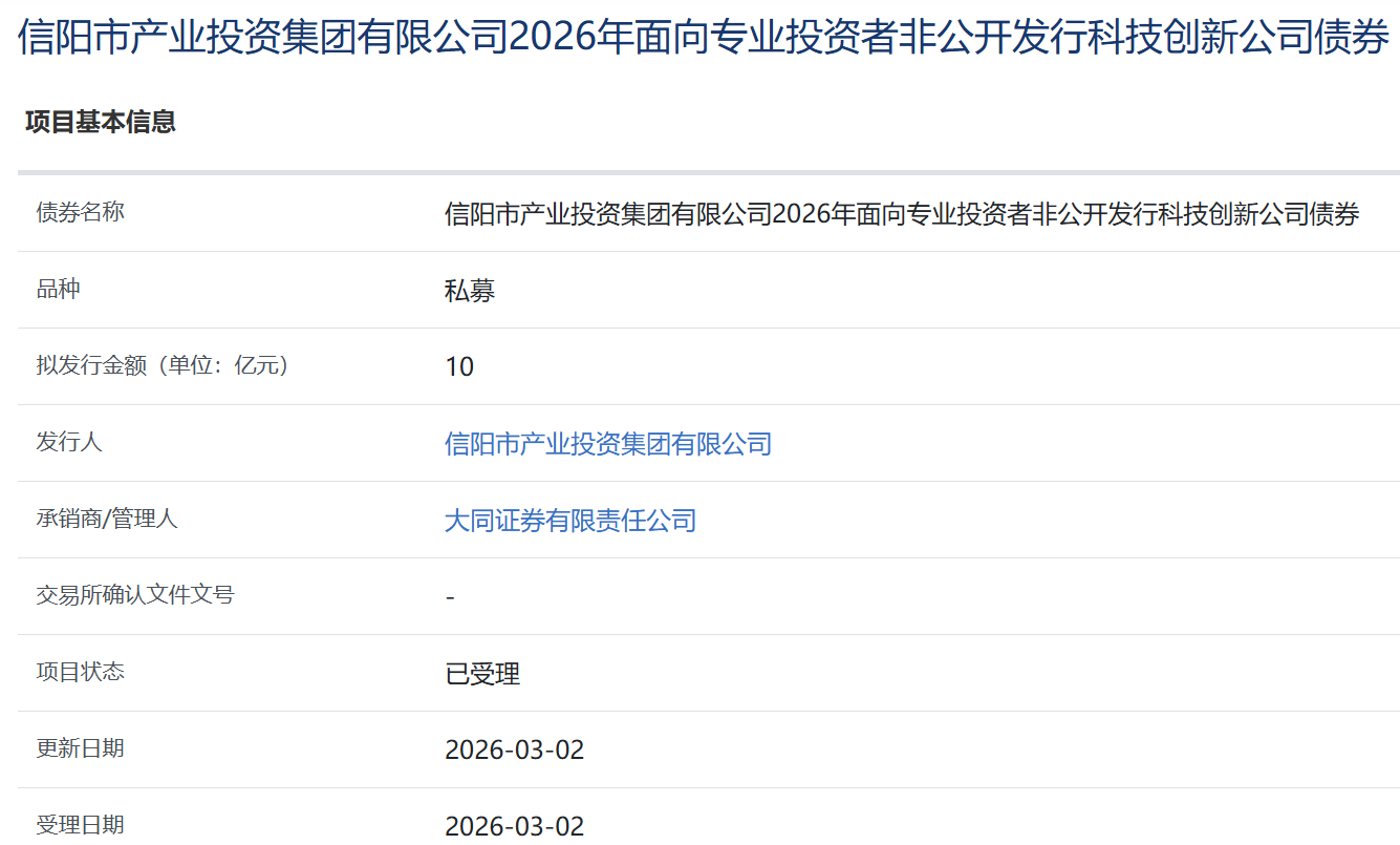 【大河财立方消息】3月2日,信阳市产业投资集团有限公司2026年面向专业投资者非公开发行科技创新公司债券项目获上交所受理。