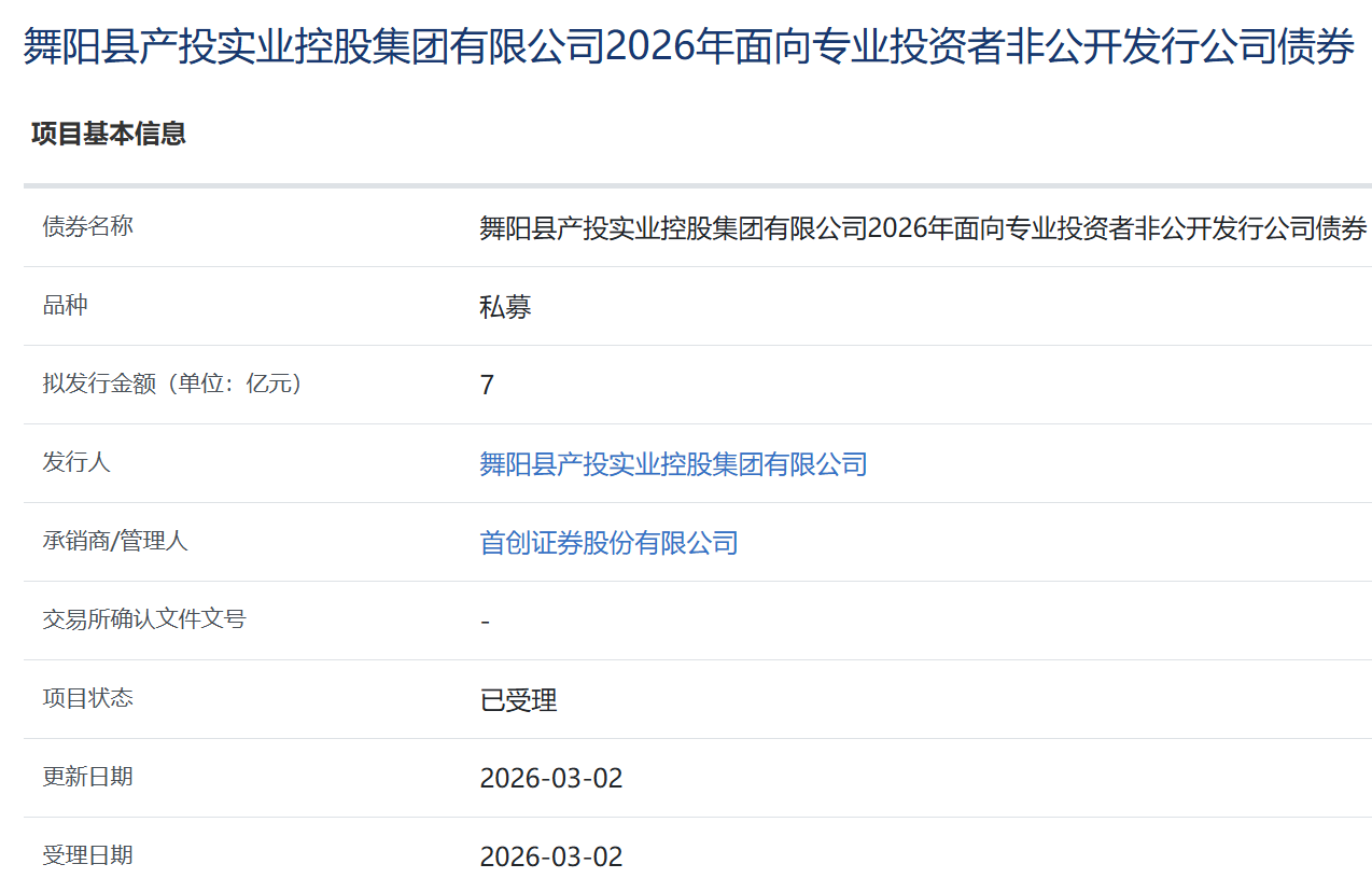 【大河财立方消息】3月2日,舞阳县产投实业控股集团有限公司2026年面向专业投资者非公开发行公司债券项目获上交所受理。本期债券拟发行金额7亿元,承销商/管理人为首创证券。