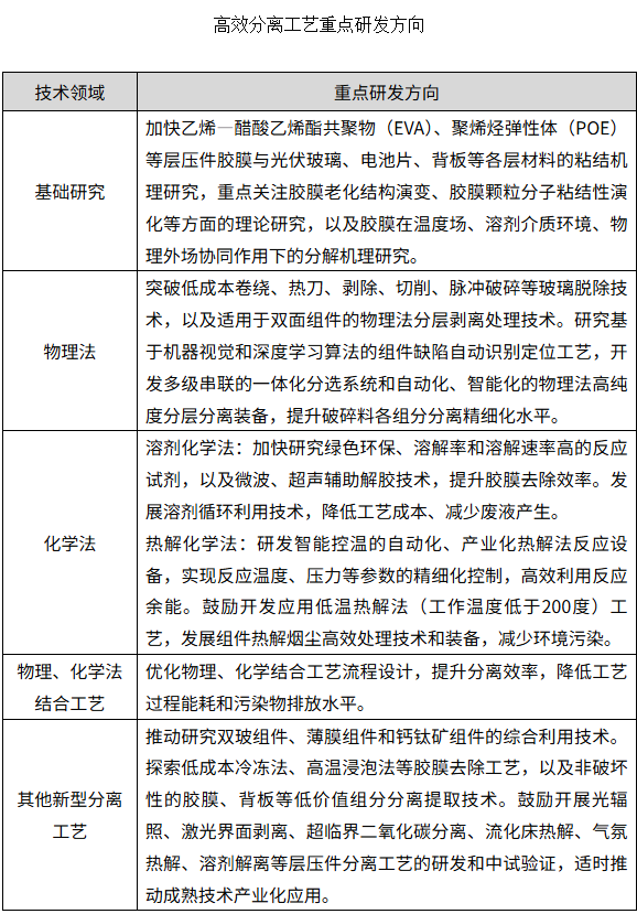 (二)突破高效分离工艺。开展光伏组件胶膜粘结机理研究,丰富完善胶膜低成本解离技术理论体系。加快研发晶硅单玻、双玻等组件的物理法、化学法、结合工艺及新型分离工艺,攻克光伏组件部件与胶膜的绿色、高效分离技术,鼓励开发非破坏性拆解技术,探索完整玻璃等材料获取路径。详见附件《高效分离工艺重点研发方向》。(工业和信息化部、生态环境部按职责分工负责)