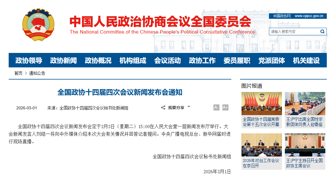 据中国政协网,全国政协十四届四次会议新闻发布会定于3月3日(星期二)15:00在人民大会堂一层新闻发布厅举行。大会新闻发言人刘结一将向中外媒体介绍本次大会有关情况并回答记者提问。