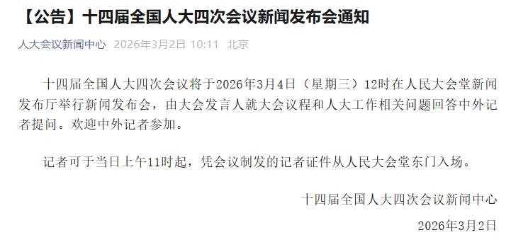 据人大会议新闻中心,十四届全国人大四次会议将于2026年3月4日(星期三)12时在人民大会堂新闻发布厅举行新闻发布会,由大会发言人就大会议程和人大工作相关问题回答中外记者提问。