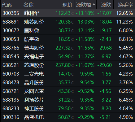 半导体产业链持续走弱,国科微、恒烁股份、普冉股份、芯原股份跌超10%。稀土永磁概念集体下挫,中稀有色、盛和资源跌停。
