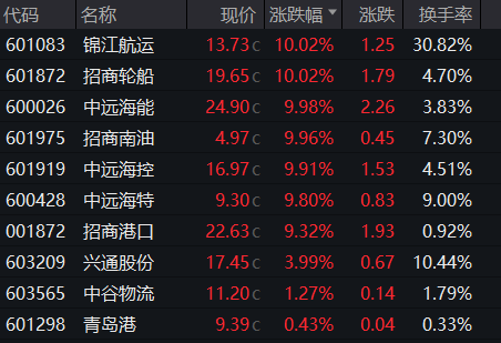 航运板块走高,锦江航运、招商轮船、中远海能等多股涨停。