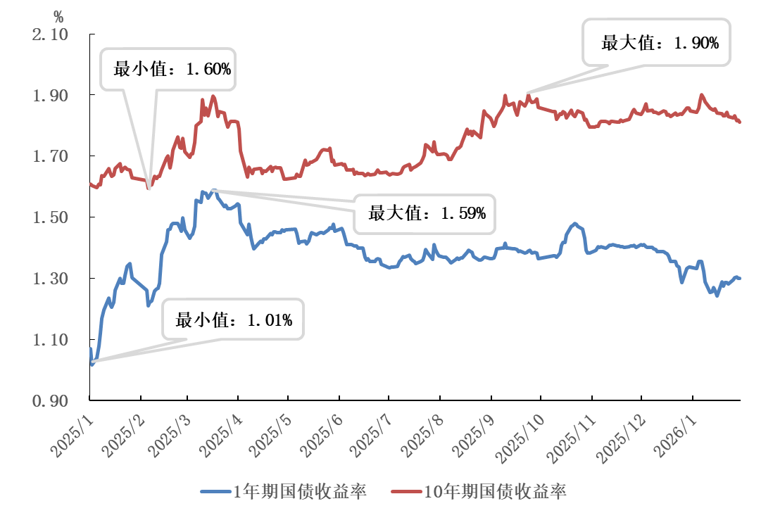 2026年1月,现券市场成交额36.1万亿元,同比增加27.8%;银行间债券市场现券换手率为18.1%,环比下降1个百分点;10年期国债活跃券买卖价差为0.45个基点。2026年1月末,10年期国债收益率为1.81%;10年期与1年期国债收益率利差为51个基点,环比基本持平;3年期AAA级中期票据收益率与3年期国债收益率的利差为44个基点,较2025年末收窄6个基点。