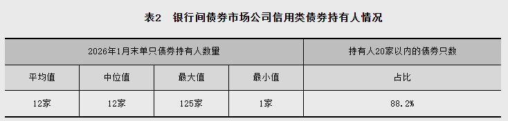 2026年1月末,银行间债券市场的法人机构成员共3906家,全部为金融机构。从持债规模看,公司信用类债券前50名投资者2持债占比53.8%,主要集中在国有大型商业银行(自营)、公募基金(资管)、保险类金融机构(资管)等;前200名投资者持债占比84.7%。