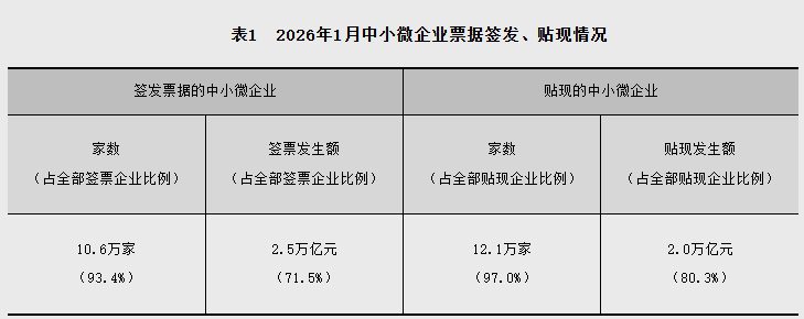 2026年1月,商业汇票承兑发生额3.5万亿元,贴现发生额2.6万亿元。2026年1月末,商业汇票承兑余额21.0万亿元,同比增加5.4%;贴现余额16.0万亿元,同比增加10.3%。
